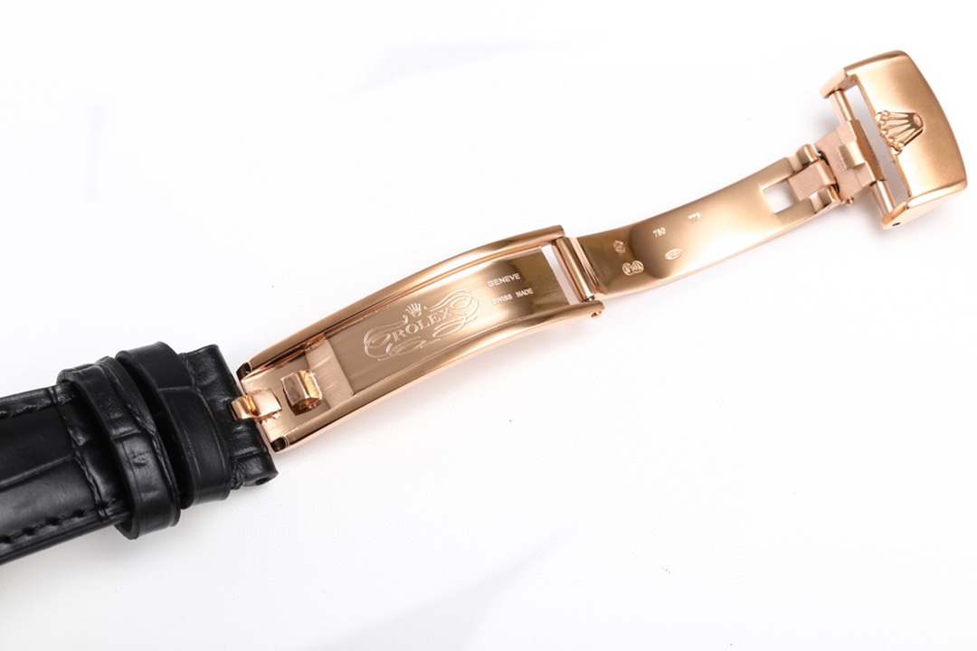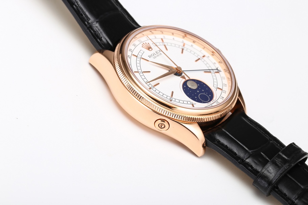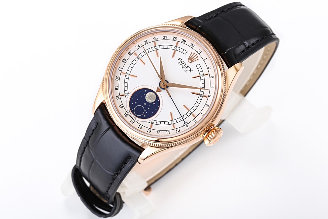 | Rolex Cellini Moonphase 39mm White Dial Rose Gold Bezel Black Leather 50535-0002 | |